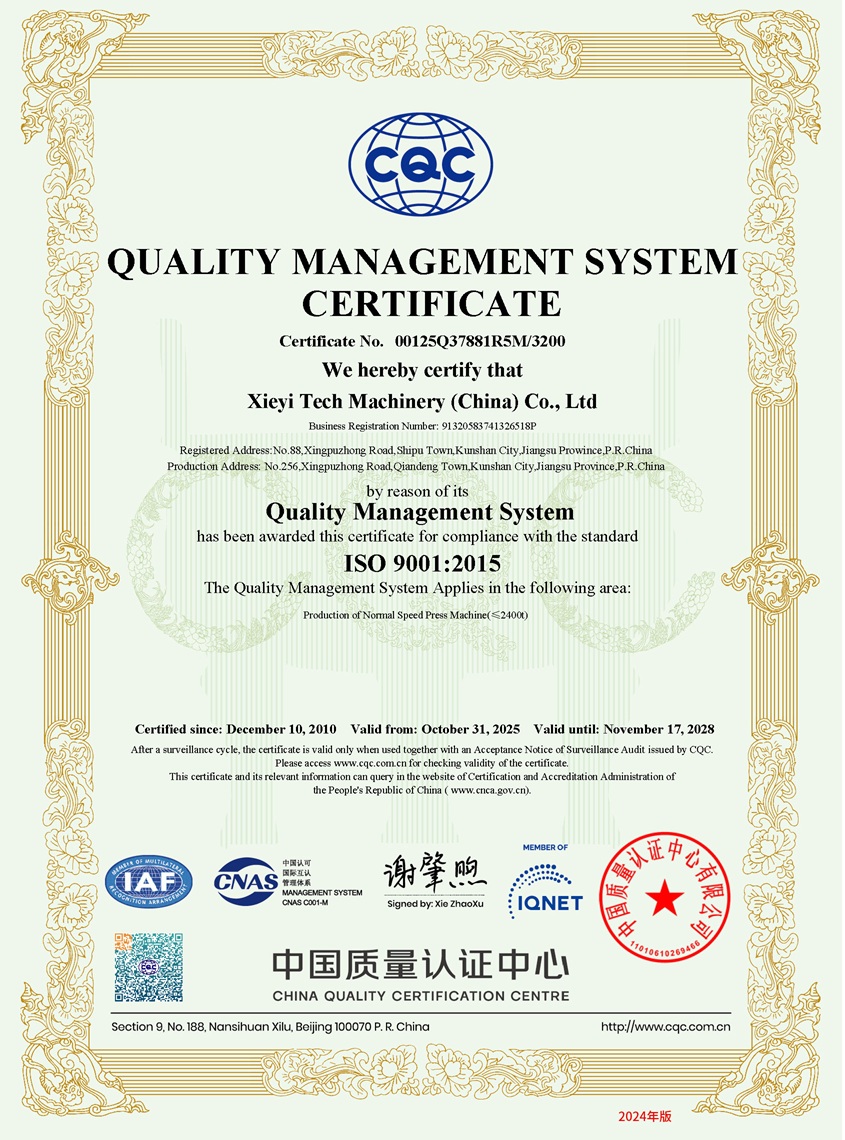 Our Xie Yi Tech Machinery (China) Co., Ltd. has passed the ISO9001-Quality management system certification